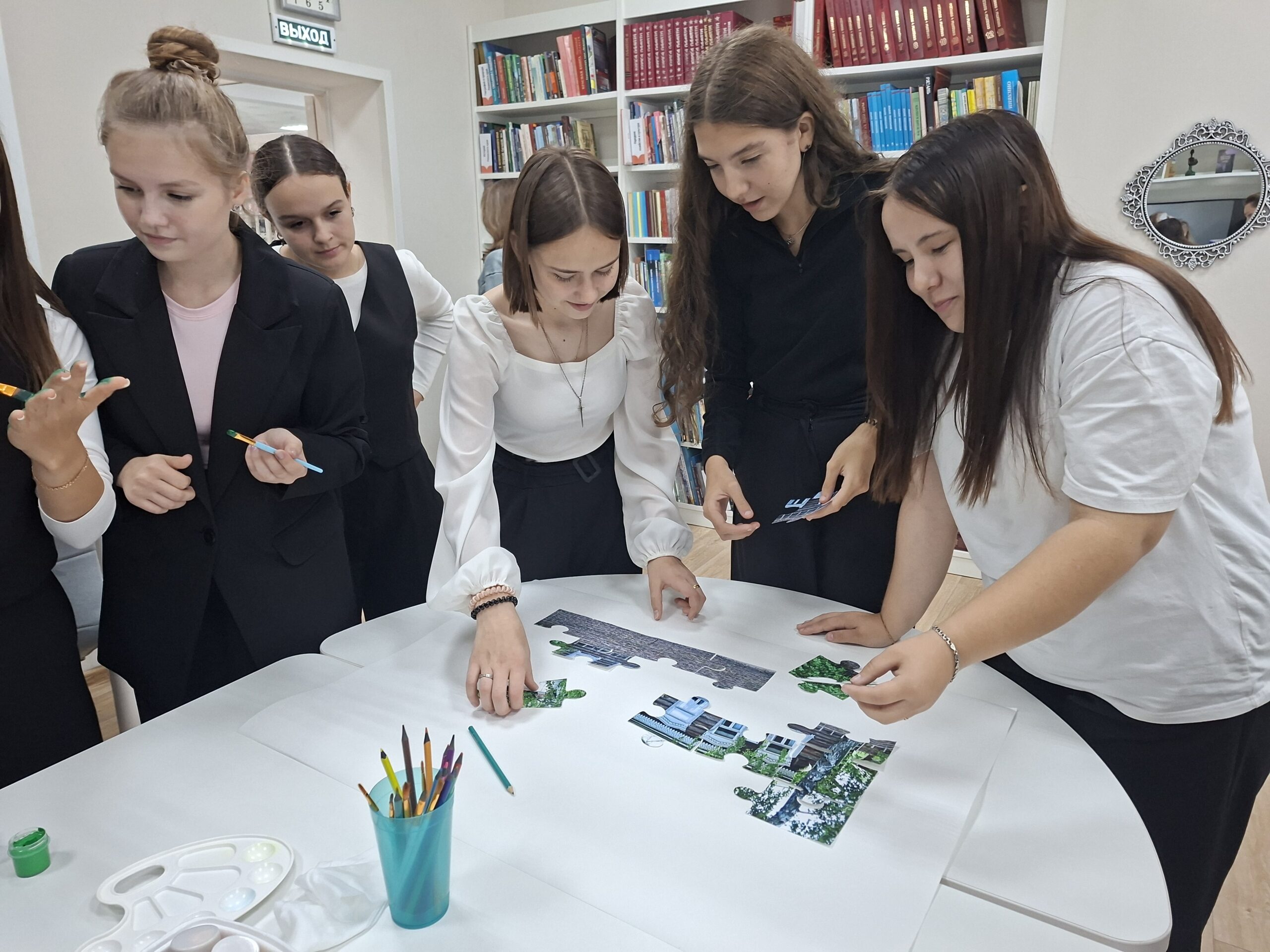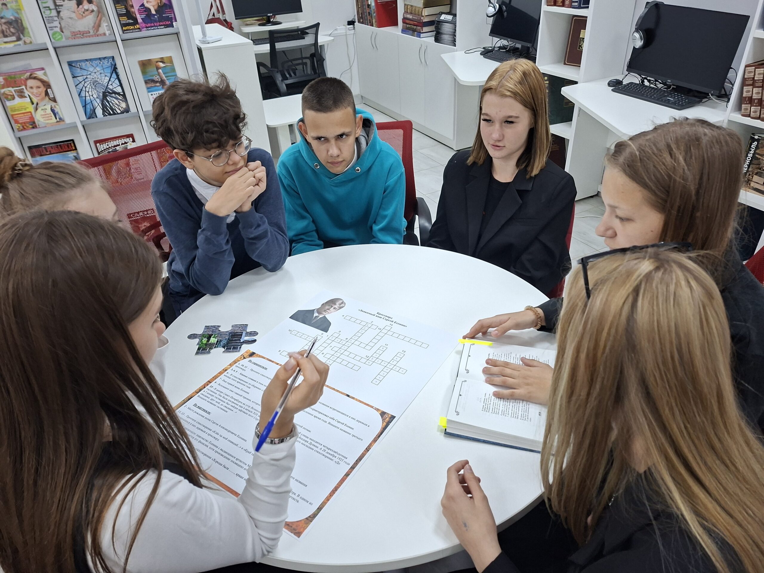 Школьники разделились на две команды и выполняли различные задания: разгадывали кроссворд и анаграммы, собирали пазлы, отгадывали по QR- коду самые известные стихи Сергея Есенина.
