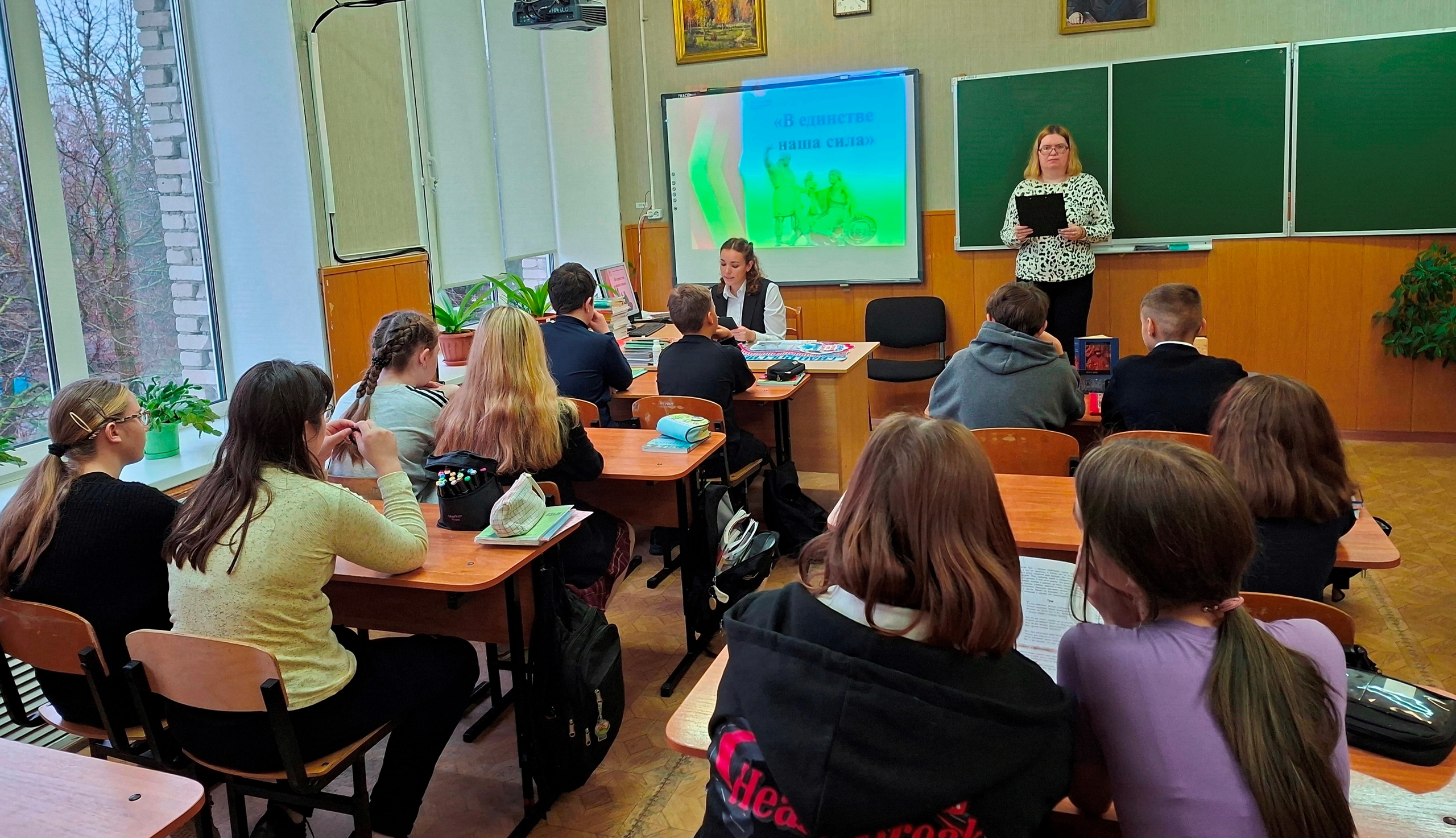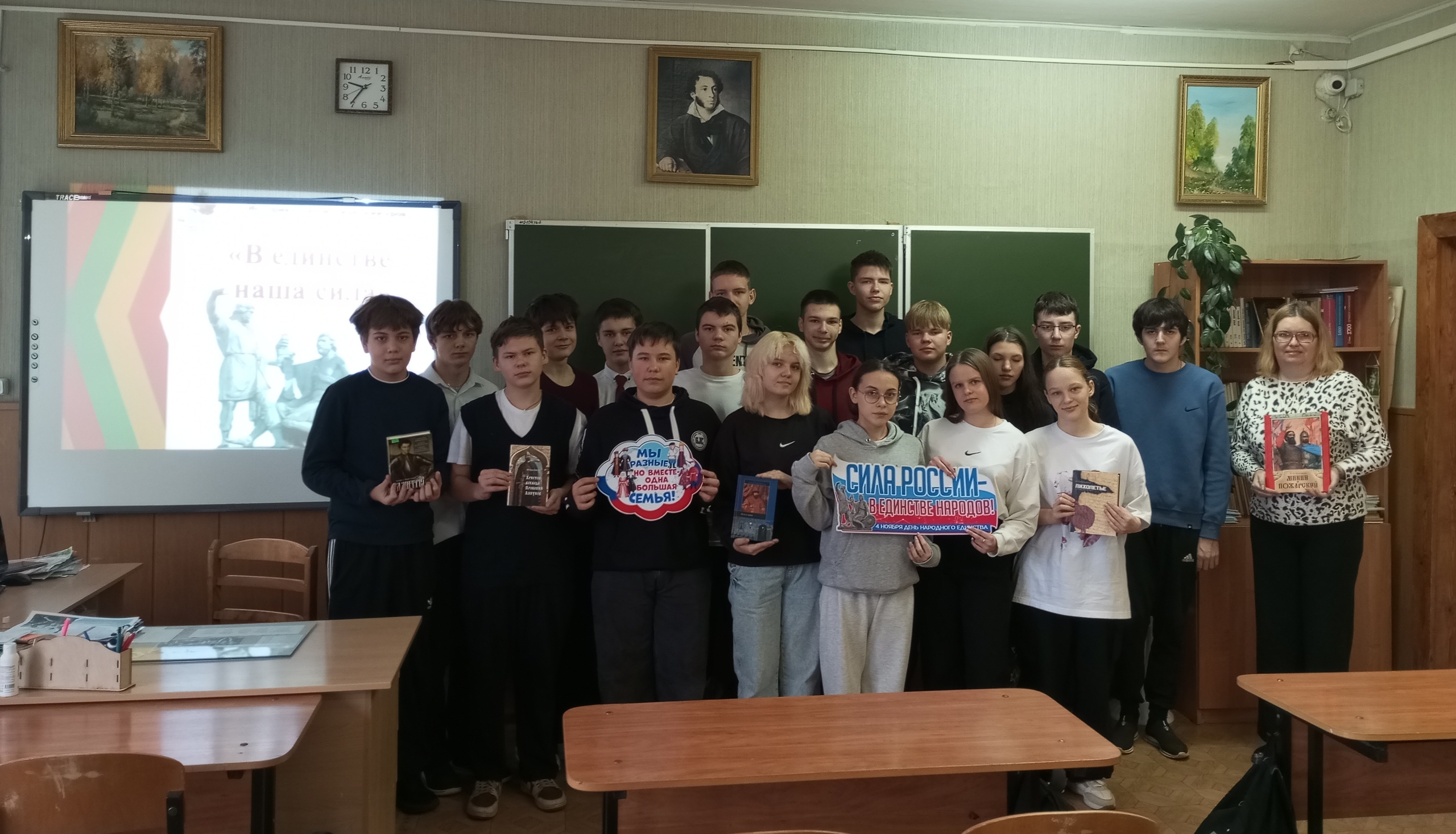 5 ноября 2025 года для учащихся 7 «А» и 9 «А» классов Шиловской средней школы №3 сотрудники Межпоселенческой библиотеки им. Н.С. Гумилева совместно с Движением Первых провели историко-патриотический урок, приуроченный к празднованию Дня народного единства.