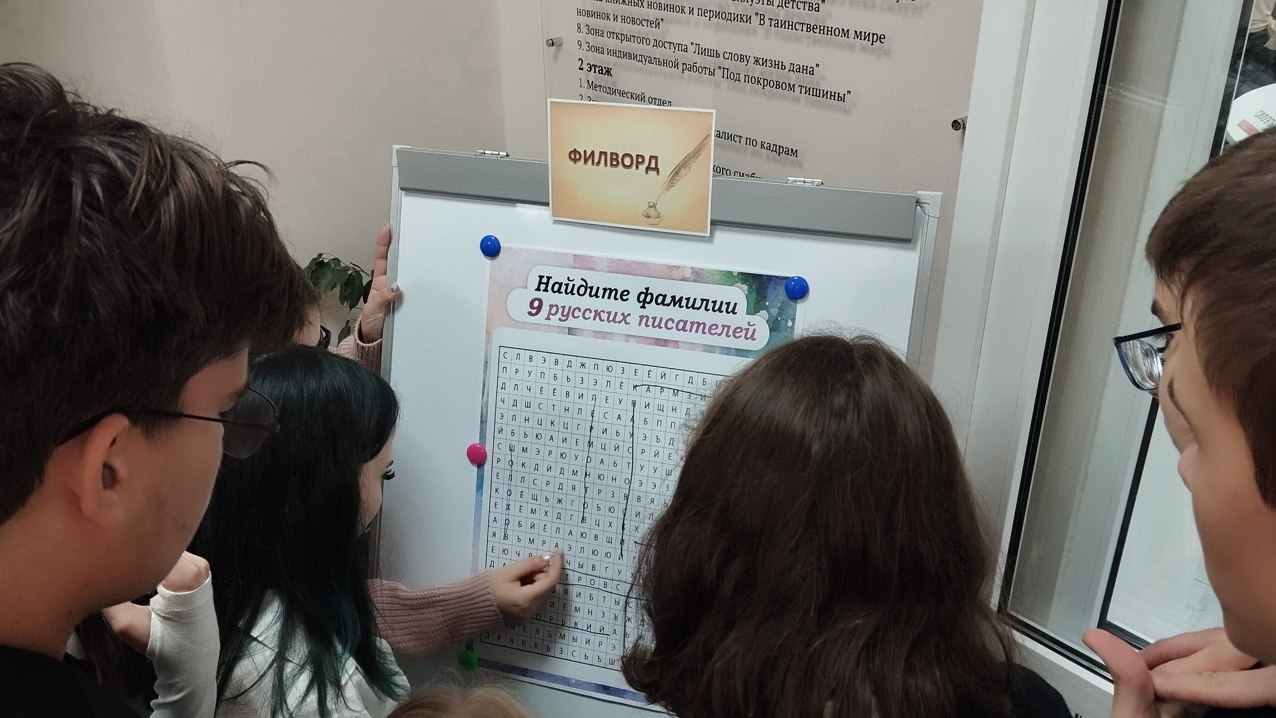 Старшеклассники разделились на две команды и посетили различные импровизированные «станции» с необычными заданиями на знание знаменитых романов и повестей: «Литературная история», «Книжный бум», «Фоторобот», «Ярмарка вещей», «Филворд», «Шифровальная» и «Пазлы».