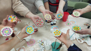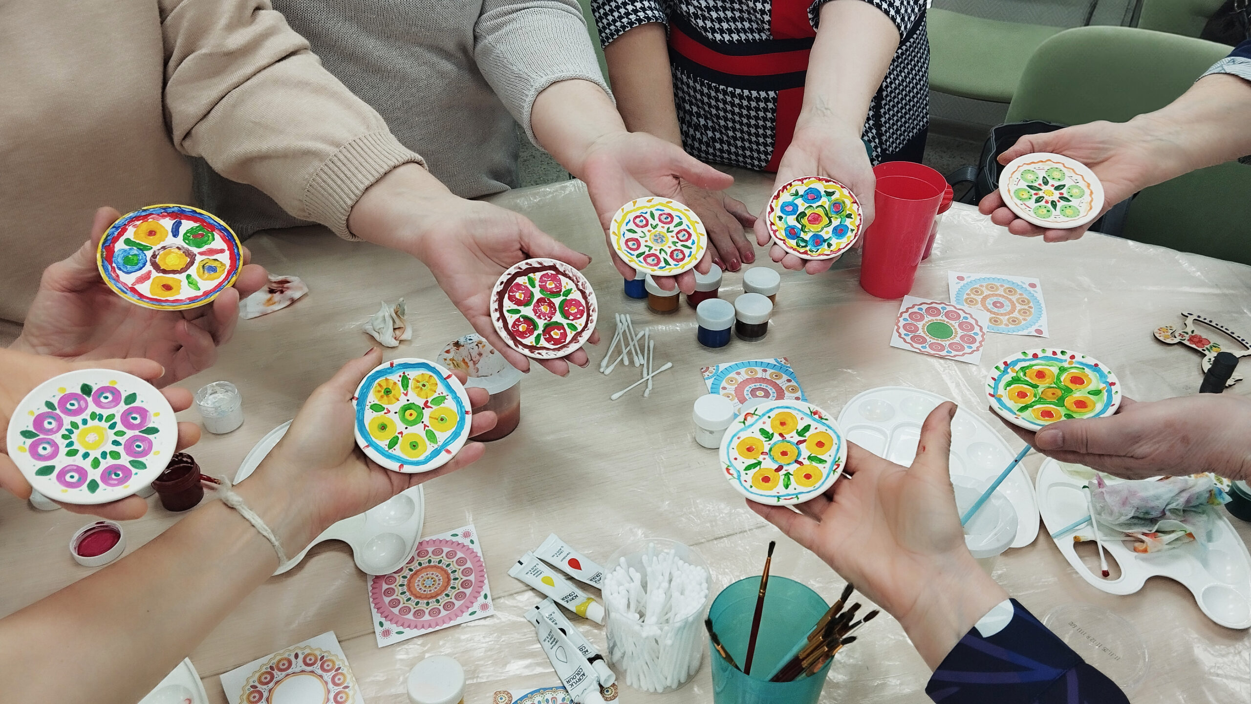 Участники мастер-класса познакомились с историей возникновения дымковской росписи в городе Вятки, с узорами росписи, узнали секреты мастерства. А также, на память об этом мероприятии, участники мастер-класса расписали гипсовые тарелочки, используя элементы дымковской росписи. Получился отличный, яркий сувенир в подарок к Международному женскому дню.